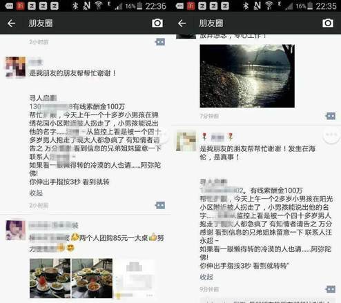 6月23日消息,有网友在朋友圈转发一则寻人信息,一个十多岁的小男孩在锦绣花园小区被拐走,这一消息请求转发扩散,并且提供线索酬金100万,但没有具体城市地区位置信息,被拐的孩子联系人是“汪某某”。很多网友都留言转发了这一信息,并且也请求其他朋友转载。不过,记者调查发现,这一寻人信息是一则虚假的信息,360手机安全专家则表示,其中的电话号码很可能被更换,网友不要贸然拨打。