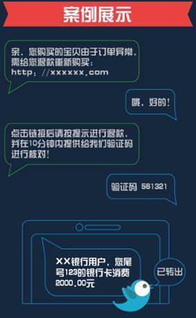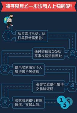 360手机安全专家指出,“网购退款诈骗”存在一个容易判断的诈骗“三步曲”:首先,骗子会致电告知用户订单出问题或多扣了款,给受害者退款;其次会通过QQ或手机短信给受害者发一段网址,要求受害者在网址中填入银行帐号等个人信息;第三会要求受害者在短时间内将手机收到的验证码发给对方。