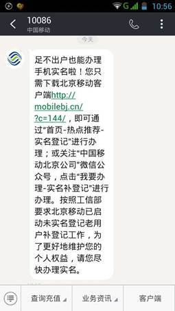 自9月1日正式推行手机实名制之后,实名登记工作已经取得不少进展,但仍有一些老用户未补登实名制。记者了解到,这一空窗期给了一些不法分子钻空子的机会。360手机安全专家告诉记者,近日360手机安全中心拦截到一批假冒运营商的短信,号称加微信就能代办实名认证,实际上是一场骗局。